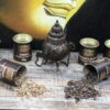 Burning Incense Resin: Light the charcoal and place it in your incense holder. Hold the charcoal with tongs. The charcoal will self-ignite across the surface. When the edges of the charcoal turn grey, it’s the perfect moment to add the resin. Many people add sand to the incense holder to help absorb heat.