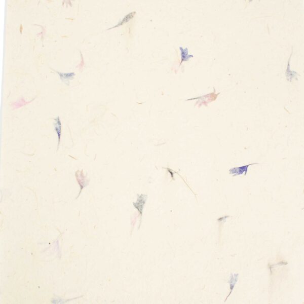 Bring a soft floral detail to your projects with this A4 Lokta Craft Paper in a cornflower petal design. Handmade in Nepal, each sheet features delicate blue and purple petals set into a natural, lightly textured base. This 20-sheet pack showcases real pressed petals embedded during the traditional papermaking process. The creamy background is flecked with visible fibres, while scattered cornflower petals add gentle colour and organic variation. Each sheet is slightly unique, reflecting its handmade nature.