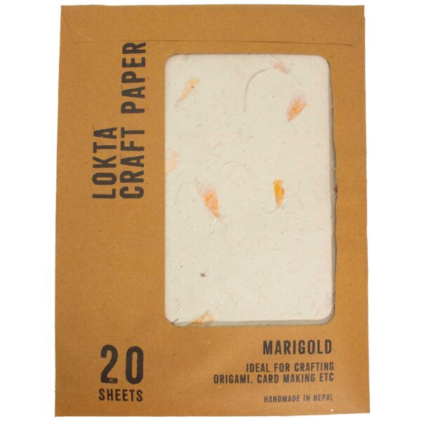 Add a natural floral touch to your crafts with this A4 Lokta Craft Paper in a marigold petal design. Handmade in Nepal, each sheet features visible pressed petals set within a soft, textured base for a beautifully organic finish. This 20-sheet pack showcases delicate marigold petals embedded into the paper during the traditional making process. The result is a lightly textured surface with subtle fibres and warm orange accents scattered across a natural background. No two sheets are exactly the same, giving every project its own character.