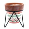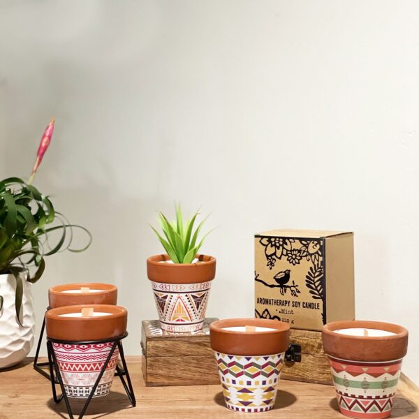 Made with natural soy wax and a wooden wick, this candle produces a soft crackle as it burns, enhancing its calming, fireside feel. It is poured into a rustic terracotta pot, displayed on a simple black metal stand that gives the candle a distinctive, decorative presence even when unlit.