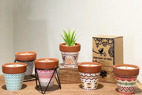 Poured into a rustic terracotta pot, the candle sits in a simple black metal stand that elevates it slightly, giving it a relaxed, earthy look. A wooden wick adds gentle character as it burns, while the natural soy wax ensures a clean, even flame. The illustrated kraft box makes it an easy choice for gifting or seasonal home styling.