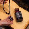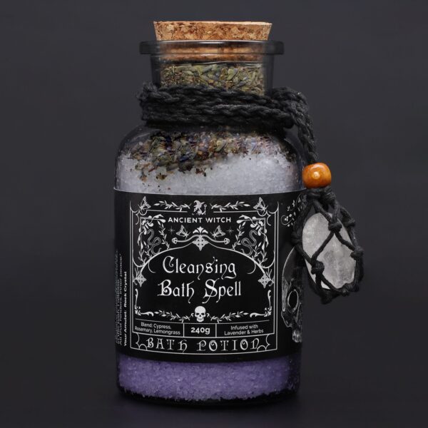 Cleanse your energy and unwind with the Cleansing Bath Spell Potion. Made with Epsom salt, lavender, and purifying herbs, this potion is infused with essential oils of cypress, rosemary, and lemongrass to promote renewal and inner clarity. Presented in an apothecary-style glass bottle sealed with a cork lid, it is wrapped with a black cord necklace featuring a genuine rock crystal tumble stone, known for its cleansing and protective qualities. The layered salts and botanicals create a visually enchanting ritual bath experience.