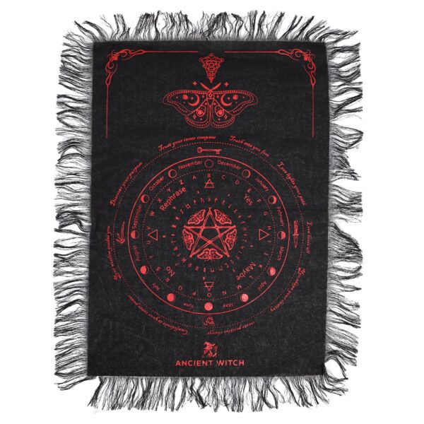 Create a bold and atmospheric space for your readings with the Mystic Moth Pendulum Divination Cloth in Black & Blood Red. The striking red design stands out against deep black fabric, featuring a detailed mystic moth above a symbolic divination layout that draws attention and enhances focus. Perfect for pendulum readings, tarot spreads, crystal layouts, or altar styling, this cloth helps define your ritual space while adding a dramatic, mystical aesthetic. The soft fringe edges give it a handcrafted feel, while the intricate symbols invite curiosity and meaning.