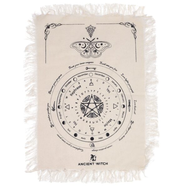 Bring calm focus and symbolic meaning to your readings with the Mystic Moth Pendulum Divination Cloth. Featuring a beautifully detailed moth design above a circular divination layout, this cloth creates a serene and intentional space for pendulum work and spiritual practice. The natural cotton background paired with black printed details gives it a clean, timeless look that suits any altar or reading setup. Soft fringe edges add a handcrafted touch, while the symbolic elements invite curiosity and connection.