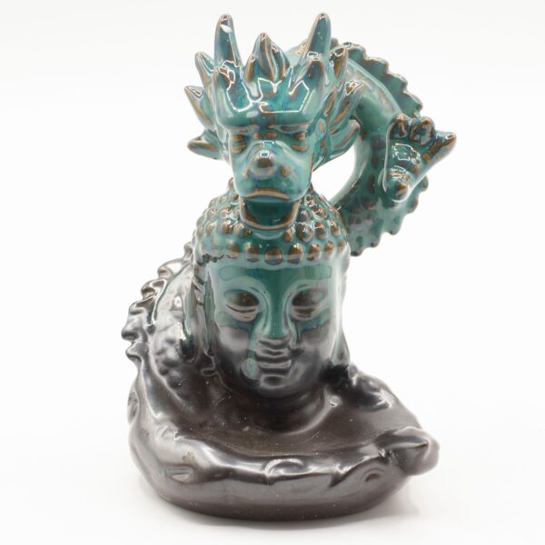 Create a striking and tranquil focal point with this Dragon Over Buddha backflow incense burner. Designed for use with backflow incense cones, it produces a flowing smoke effect that cascades from the dragon above and drifts down over the Buddha’s face. Made from glazed ceramic, the piece combines deep charcoal tones with blue-green highlights across the detailed dragon and serene Buddha head.