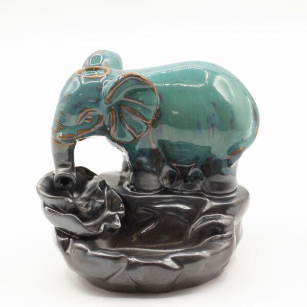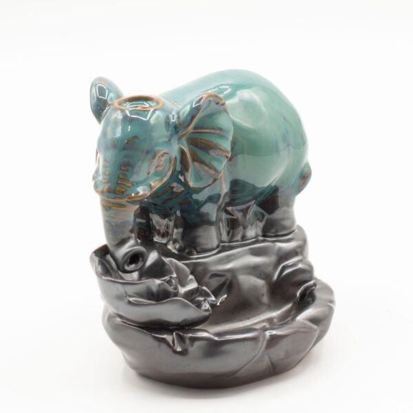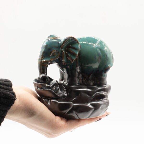 Create a calm, flowing atmosphere with this Elephant at Pool backflow incense burner. Designed for use with backflow incense cones, it produces a soothing waterfall effect as smoke gently cascades from the elephant into the pool below. Made from glazed ceramic, the design features a detailed elephant standing above layered rock formations. The glossy blue-green finish blends into darker tones at the base, enhancing the movement of the descending smoke.