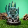 Add a dramatic touch to your space with this Skull in Hand backflow incense burner. Designed for use with backflow incense cones, it creates a striking cascading smoke effect that flows down through the skull and into the base below. Crafted from glazed ceramic, this detailed design features a skull held within a sculpted hand, with flame-like shapes rising behind it. The glossy blue-green glaze blends into darker tones at the base, enhancing the depth and movement of the descending smoke.