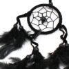This handcrafted dream catcher features a 6.5 cm wooden circle, elegantly wrapped in luxurious black, white, and red suede cord. Adorning this piece are six 7 cm long feathers, also in complementary colours, delicately suspended on suede cords. The heart of the dream catcher is crafted with the same vibrant strings, showcasing a small bead at its centre.