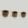 Bring natural warmth and texture into your home with this set of three banana leaf and seagrass baskets in rich earthy brown tones. With practical sizes (33cm, 28.5cm and 24cm), these baskets offer stylish storage while adding an organic, relaxed feel to any room. Woven from natural fibres, each basket features a soft rounded shape, subtle striped detailing, and sturdy looped handles for easy lifting. The deeper brown tones create a cosy, grounded look that pairs beautifully with wood furniture, plants, and neutral interiors. Decorative tassel-style accents add a rustic, artisan-inspired touch.