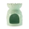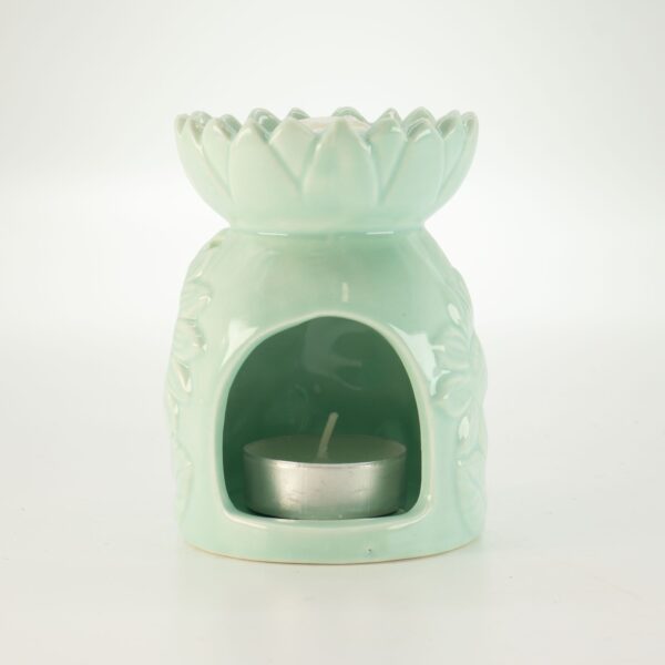 The raised sunflower design wraps around the body, while the flower-shaped top dish holds fragrance oils or wax melts securely as they warm. A standard tealight candle placed inside the base gently heats the dish, allowing fragrance to slowly diffuse throughout the room. The soft pastel green glaze gives the burner a fresh, natural look.