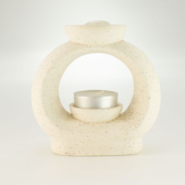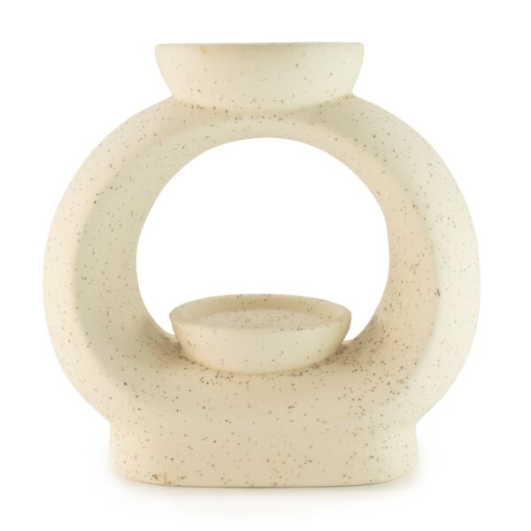 A wide dish at the top holds fragrance oils or wax melts, while a tealight candle placed on the inner platform warms the dish to slowly diffuse scent throughout the room. The speckled off-white glaze adds a subtle handcrafted character, allowing the burner to blend effortlessly with modern, Scandinavian, or nature-inspired interiors.