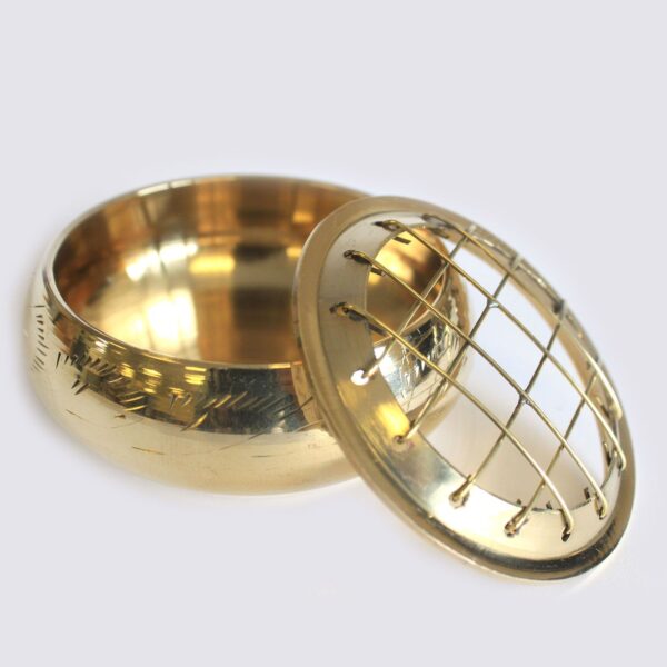 This compact brass incense jar is designed for burning charcoal, resins, or herbs. The removable grid lid ensures even heat distribution while allowing the fragrance to flow gently through, creating a calming atmosphere in your home or sacred space. Made from polished brass with light decorative etching, the jar is both sturdy and stylish. Its small size makes it perfect for travel, meditation corners, or altars with limited space.