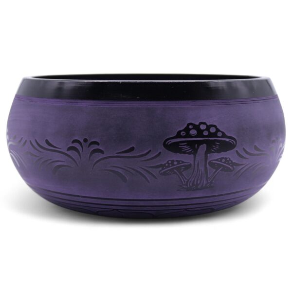 The outer surface features delicate mushroom motifs, while the interior reveals a serene meditating figure surrounded by intricate patterns. Each bowl is individually crafted and finished with care, ensuring both aesthetic beauty and exceptional sound quality. Ideal for practitioners who want a powerful sound tool and a captivating décor piece, the Purple Haze bowl blends artistry, mindfulness, and vibrant energy in one impressive design.