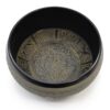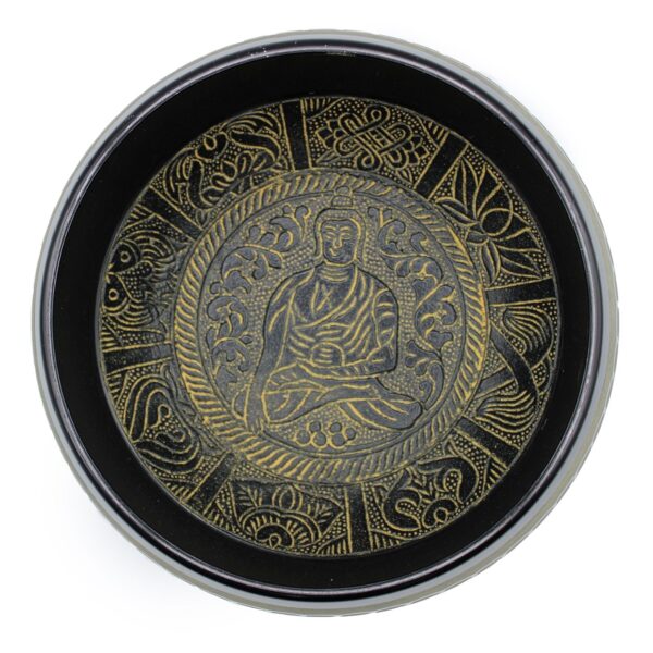 This extra loud singing bowl is designed to deliver a powerful, room-filling sound with a strong visual presence to match. The dark, brushed finish is detailed with traditional script on the exterior, while the base features a single Buddha figure surrounded by ornate engraved patterns. Measuring 21cm in diameter and 12.5cm in height, the bowl produces a G#4 note, offering a clear, assertive tone with long sustain. Its larger size and weight allow the sound to carry with intensity, making it well-suited to group meditation, sound work, or spaces where a more pronounced resonance is desired.