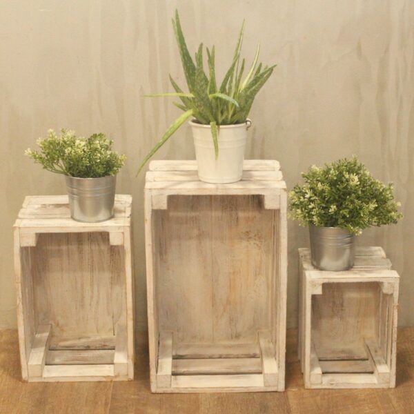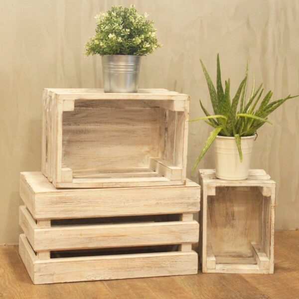 The whitewashed finish softens the natural wood grain, allowing the crates to blend effortlessly into light, neutral interiors. Suitable for kitchens, pantries, shelving units, or utility rooms, they work well for storing produce, household essentials, books, or everyday items.