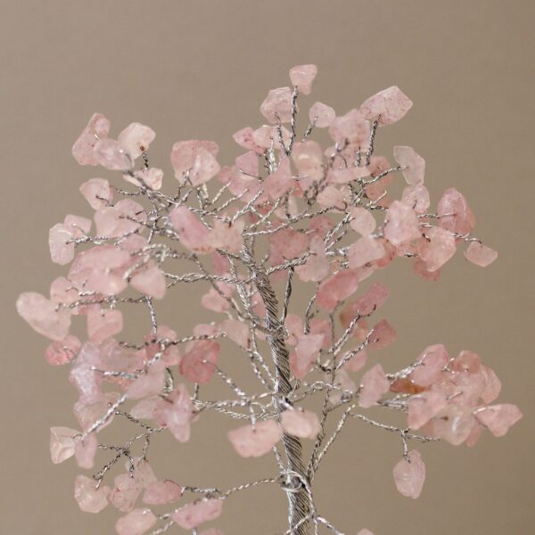 The delicate branches of the tree are adorned with shimmering rose quartz, known for its calming properties. This captivating piece can transform any room into a serene sanctuary, making it an ideal addition to your home or office.
