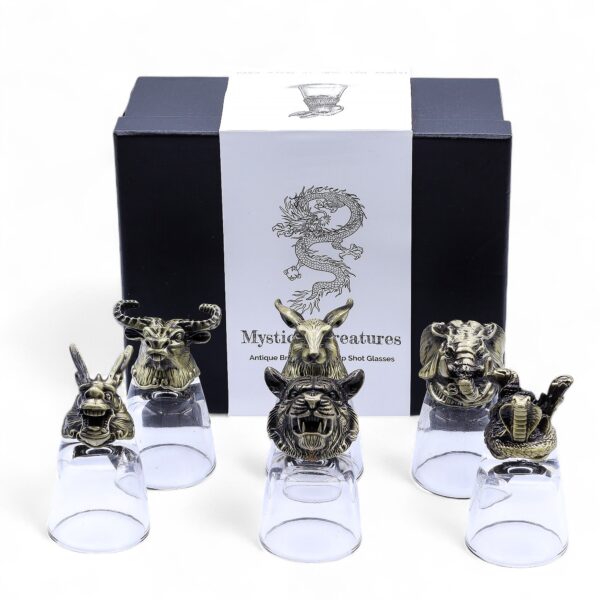 More than just drinkware, these shot glasses double as striking decorative pieces that tell stories of power and tradition, making them perfect for your home or as a thoughtful gift. Each glass showcases a clear vessel set upon a finely crafted antique bronze-style base, representing iconic mystical animals such as the Elephant (wisdom & strength), Tiger (courage), Snake (transformation), Dragon (power & luck), Rabbit (prosperity), and Ox (endurance & stability). These symbolic designs offer strong gifting appeal and collector’s value.