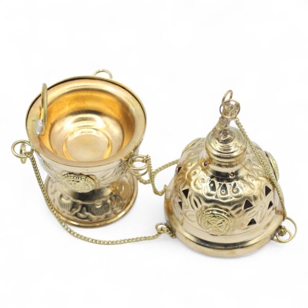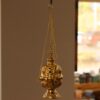 Made in India from fine-quality brass, this hanging incense burner brings a traditional, sacred atmosphere to your home or meditation space. The detailed engravings and cross finial reflect classic design influences, while the threaded chain allows easy suspension and movement during use. Ideal for burning resin, incense cones, or charcoal, it fills the air with rich, aromatic fragrance while adding a timeless decorative element.