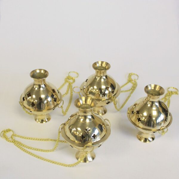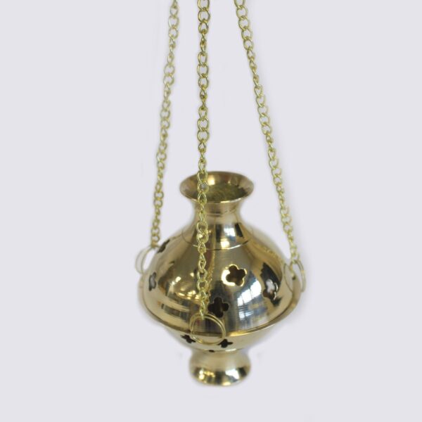 This elegant hanging brass incense burner is ideal for burning charcoal, resins, or incense. With a traditional thurible design, detailed cut-outs, and sturdy chains, it adds atmosphere and beauty to rituals, meditation, or as a striking home décor accent. Crafted from polished brass, it offers durability and timeless style.