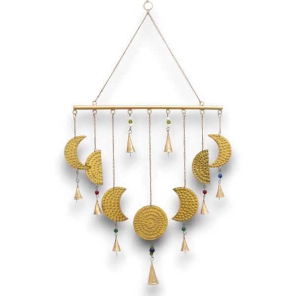 Made in India, this exquisite piece showcases the phases of the moon in stunning brass, serving as a striking addition to any space. Measuring 43×40 cm, it features intricate designs representing each lunar phase, symbolising the cycle of life and renewal. The addition of brass bells enhances its charm, creating soft, soothing sounds that flow gently with the wind.