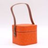The set comes with a vibrant orange travel case, designed for easy transportation and storage. The case is made of durable material with white stitching for added strength and aesthetic appeal, featuring secure snap buttons on the sides. Inside, the case is lined with a soft, cushioned material to protect the teapot and cups from damage.