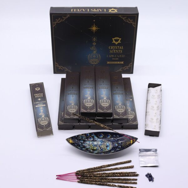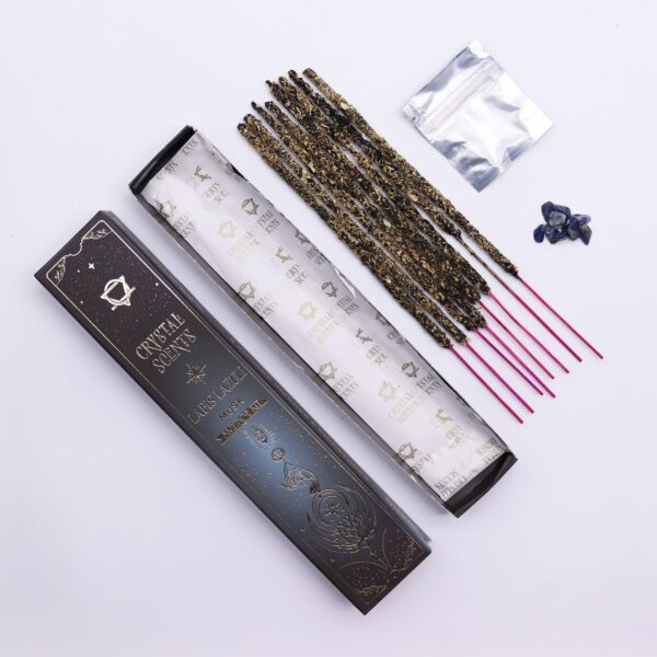 A small bag of real lapis lazuli chips is included, bringing a touch of celestial blue that complements the mystical theme of the range. The sticks are wrapped in printed protective paper and presented in a dark, night-sky-inspired cardboard sleeve.