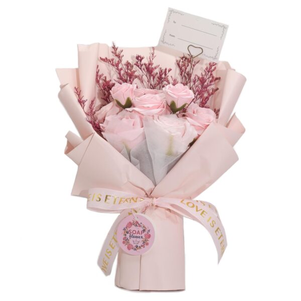 Soft, graceful, and endlessly romantic, this bouquet of pink soap roses captures the feeling of love in full bloom. Beautifully wrapped in pale pink paper and tied with a satin ribbon embossed with “Love is Eternal”, it’s a heartfelt gift that lasts far longer than fresh flowers.