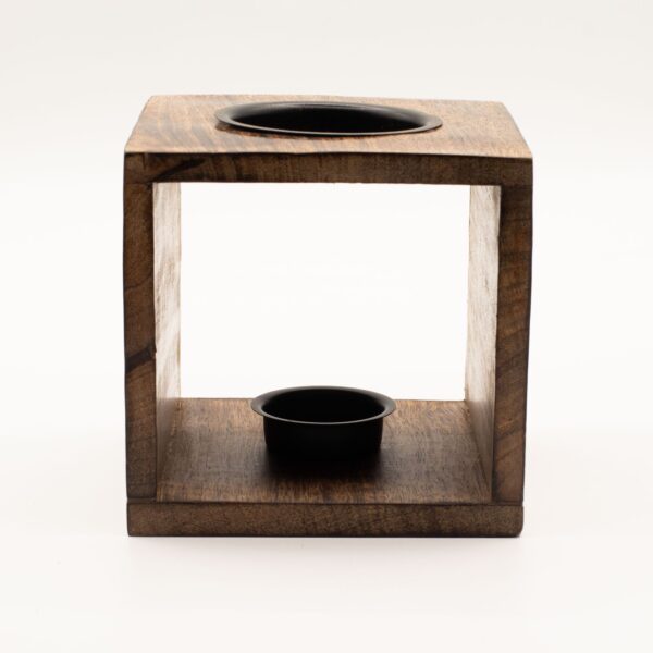 The sturdy, open-sided cube provides a safe and ventilated housing for a tealight, casting a warm, atmospheric glow through the frame. This durable, artisan-carved burner is a timeless addition, appealing to those who value eco-friendly materials and symbolic home decor.