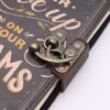 A timeless leather notebook embossed with the inspiring quote “Never Give Up On Your Dreams.” Perfect for journaling, sketching, or capturing ideas, it’s both durable and meaningful. Handcrafted with 200 blank deckled-edge pages and finished with a secure metal clasp closure, this notebook combines old-world charm with modern motivation. The natural texture of the pages adds a tactile writing experience, making it an ideal keepsake for writers, dreamers, and creative minds.
