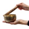 This Five Buddha singing bowl combines a rich visual design with a deep, grounding sound. The engraved exterior features traditional Buddhist script, while the base is decorated with the Five Buddha motif, adding symbolic detail without overpowering the bowl’s simple form. Measuring 11cm in diameter and 6cm in height, the bowl produces a D#3 note, offering a low, steady tone that feels calm and centred. Its size makes it easy to play, whether gently struck or used for slower, rhythmic sound work.