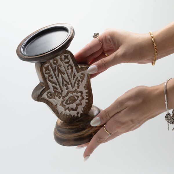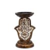 Crafted from eco-friendly, durable mango wood, each candle stand showcases the natural beauty of wood grains, each piece possessing its own unique character. The intricately carved Hamsa symbol on the front adds a beautifully detailed and meaningful decorative element. Known for its associations with protection and good fortune, the Hamsa hand enhances the ambiance of your space.