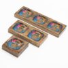 This Med Enamelled Mango Tray Set features the vibrant and protective Hamsa symbol, offering a colourful and spiritual addition to your home. The set consists of three varying sizes — single, double, and triple compartments — crafted from solid mango wood with a smooth, polished finish. Each compartment boasts a stunning, high-gloss enamelled inlay depicting a cosmic Hamsa hand in a spectrum of radiant colours. This traditional symbol of luck and protection is reimagined with a modern, psychedelic flair that makes these trays a standout decorative and functional choice.