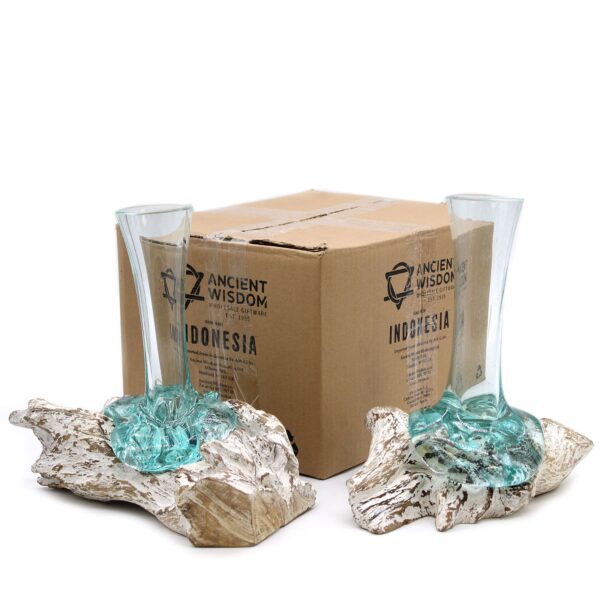 Elevate your living space with this stunning vase, crafted from exquisite molten glass and set against a beautifully textured whitewash wood base. This medium-sized piece is more than just a vessel; it’s a statement of style and sophistication.