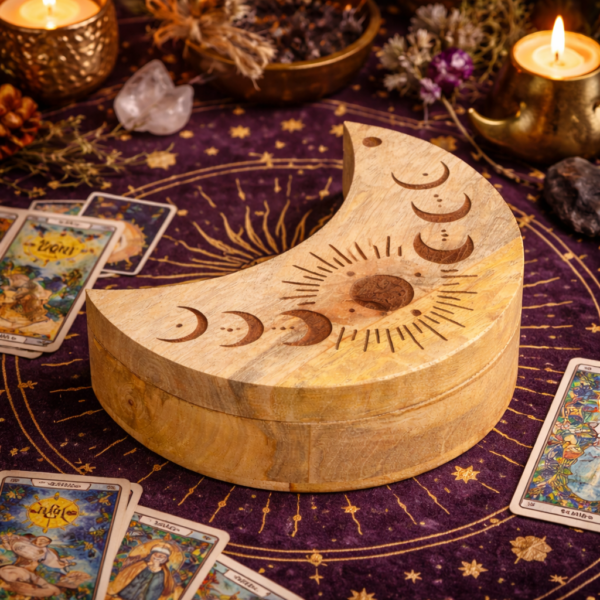 Made from natural wood, each box features its own unique grain and character, adding warmth and a handcrafted feel. Ideal for spiritual décor or anyone drawn to moon-inspired designs.