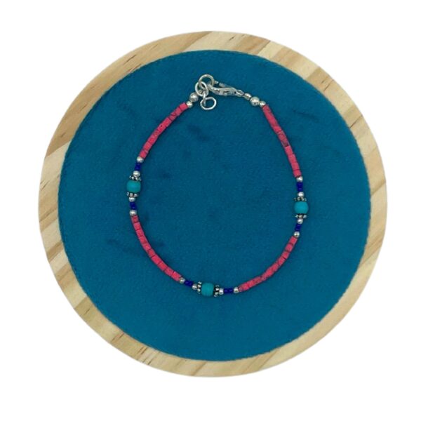 Crafted with a stunning combination of pink coral and turquoise beads, this exquisite bracelet showcases the striking contrast between the soft, warm tones of coral and the cool, refreshing hue of turquoise. Together, they create a visually captivating design that resonates with the essence of Nepalese artistry.