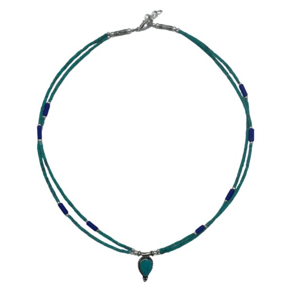 Adorn yourself with the exquisite elegance of the Nepalese Extra Fine Two Line Necklace, featuring a stunning Lapis and Malachite pendant. This unique piece is a true testament to artisanal craftsmanship, bringing together the beauty of natural gemstones in a harmonious design.