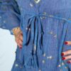 A flowing summer dress inspired by Mediterranean blues and easy coastal living. This sea blue dress is finished with a hand-painted gold fish design, adding gentle movement and a soft metallic accent to the fabric. Made in India from lightweight cotton, the dress features a V-neckline with gold trim, an adjustable tie at the waist, and a tiered skirt that drapes naturally.