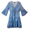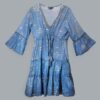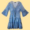 A flowing summer dress inspired by Mediterranean blues and easy coastal living. This sea blue dress is finished with a hand-painted gold fish design, adding gentle movement and a soft metallic accent to the fabric. Made in India from lightweight cotton, the dress features a V-neckline with gold trim, an adjustable tie at the waist, and a tiered skirt that drapes naturally. The three-quarter length sleeves give a relaxed shape while offering comfortable coverage for warm-weather wear.