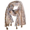 The flowing fabric drapes easily around the neck, shoulders, or waist, making it a versatile piece for daytime styling or evenings out. The coffee-toned base is balanced with lighter areas and metallic accents, giving the scarf a gentle glow without feeling heavy. Finished with tasselled ends for a relaxed, holiday-ready look.
