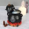 Experience the enchanting allure of the Pouring Cauldrons Backflow Burner. Simply place a backflow incense cone atop this exquisite resin cauldron burner and witness the captivating smoke flow gracefully between the cauldrons. Enhanced by flickering flames and a beautifully distressed silver-effect pentagram design, this burner is finished with a light that creates a stunning smoke effect, adding a touch of magic to any space.