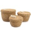 Bring calm, natural storage into your home with this set of three round seagrass and cotton baskets, each finished with a matching lid for a neat, tidy look. Sized at 29.5cm, 26cm and 21.5cm, they are perfect for keeping everyday essentials organised and out of sight.