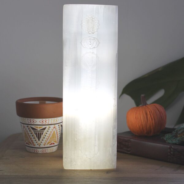 Immerse yourself in the tranquil glow of a Selenite Block Lamp and enhance your home with its serene presence. You may also like the Natural Selenite Tower Lamp. ✨