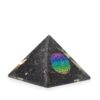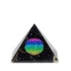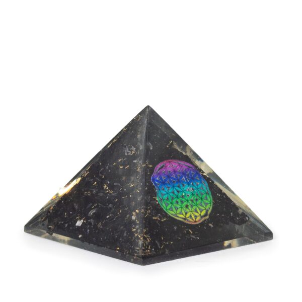 This compact orgone pyramid features the radiant Flower of Life symbol over a base filled with natural black tourmaline chips. The design represents unity, creation, and the harmony of all living things, while tourmaline is believed to ground and shield against negative energy.