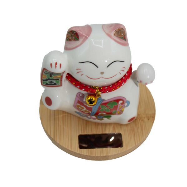 Softly coloured and full of charm, this pink-and-white Solar Money Cat brings gentle movement to bright spaces around your home or workspace. The raised paw moves using light-powered motion, creating a calm, continuous gesture with no batteries required. Finished in glossy ceramic, the cat features pastel pink details, decorative motifs, and a red cord collar with a small gold-toned bell. It sits on a smooth wooden base that gives the piece a warm, balanced look, making it easy to place on desks, shelves, or windowsills.