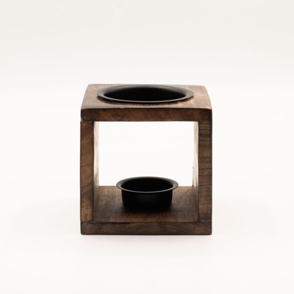 Designed for both functionality and durability, the burner includes a black metal bowl at the top for essential oils or wax melts, along with a matching metal tealight holder at the base. The open-cube structure ensures excellent airflow, allowing the tealight to burn steadily while safely diffusing fragrance throughout your space. Its compact yet sturdy design makes it easy to display, offering you a premium, high-quality accessory for aromatherapy and meditation practices.