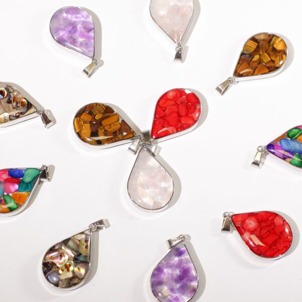 12x Steel Cased Pendant Teardrops – 12 Assorted Gemstone Chips & Shells