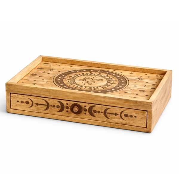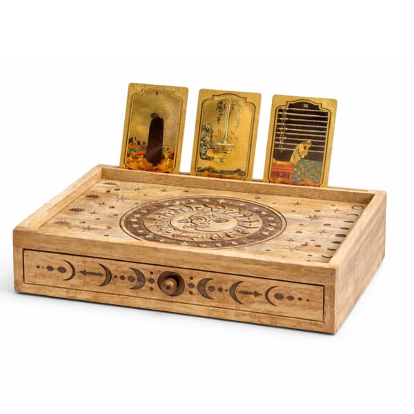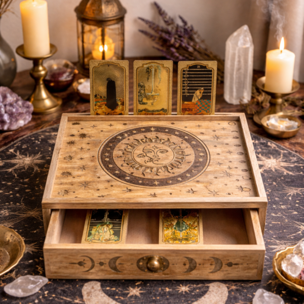 A spacious drawer underneath keeps tarot decks, crystals, or small ritual tools neatly stored and within easy reach. Crafted from natural wood, each box has its own unique grain and character, giving it a warm, handcrafted feel. Whether used for daily readings or as a decorative piece on an altar or shelf, it adds a calm and meaningful touch to any space.