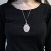 The two primary colours of opalite, blue and white, combine to create a unique shine. Together, they embody openness, peace, and cleanliness. In this necklace, the stone is beautifully encased in a delicate swirl cage, making it a stunning addition to your jewellery collection. This piece is simple yet exudes an elegant princess style that enhances any outfit.
