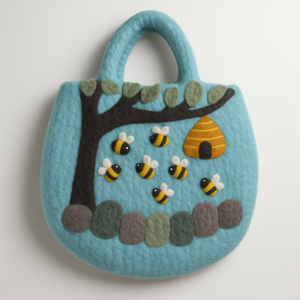 Embrace the beauty of nature with this enchanting felted bag, featuring intricate designs of trees and a delightful beehive. Each bag is lovingly crafted using high-quality felt, ensuring a soft yet durable accessory that stands the test of time.