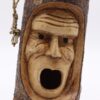A hand-carved bird house crafted in Indonesia from a natural tree trunk, showcasing a detailed “grumpy old man” face. Its rustic style infuses personality into any garden or outdoor space. The expressive face is delicately carved directly into the wood, offering a warm, handcrafted charm. The bark remains intact around the body, preserving its natural texture and ensuring each bird house is visually unique.